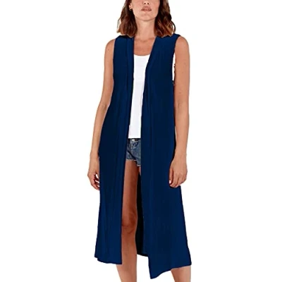STAR FASHION Woman’s Open Front Sleeveless Maxi Long Length Boyfriend Cardigan Ladies Plain Blazer Waistcoat Floaty Top Duster Jacket UK 24 26 Navyblue