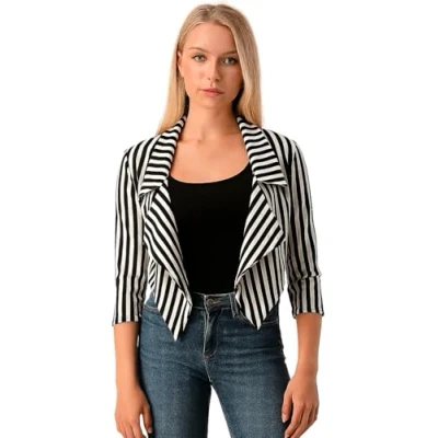 Trendy design: Our Women ¾ Sleeves Stripes Print Open Front Waterfall Crop Blazer Jacket features a stylish striped print, perfect for Halloween costumes or everyday wear. Versatile crop length: The crop length adds a fashionable touch, making it suitable for various outfits and occasions. Comfortable ¾ sleeves: The ¾ sleeves provide a balanced combination of coverage and style, ideal for transitional weather. Easy to wear: The open front design allows for easy wearing and pairing with different tops and dresses. Halloween costume option: This blazer jacket can be a trendy and unique addition to your Halloween costume collection, adding a touch of sophistication to your look.