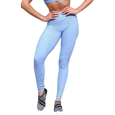 STAR FASHION Women Honeycomb Waffle Leggings Anti Cellulite High Waist Yoga Pants Tummy Control Gym Butt Lifting Textured Scrunch Tights Baby Blue Small