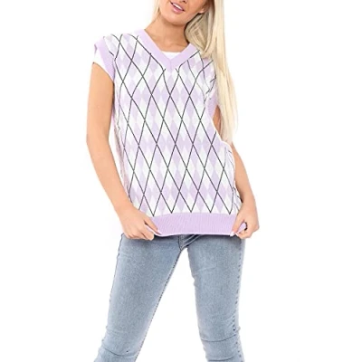 STAR FASHION Women Ladies Diamond Print Knitted Vest V Neck Sleeveless Jumper Sweater Tank Tops Size (UK_8 14) Lilac/Cream