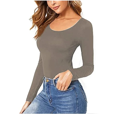 STAR FASHION Women Ladies Long Sleeve Round Neck Plain Top Stretchy Casual T Shirts Basic Slim fit Tee Tops UK Size 16 18 Mocha