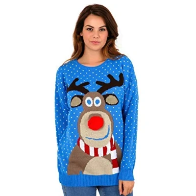 STAR FASHION Women/Ladies Men Unisex Christmas Jumper Knitted Xmas Sweater Rudolph Pom Blue 8 10