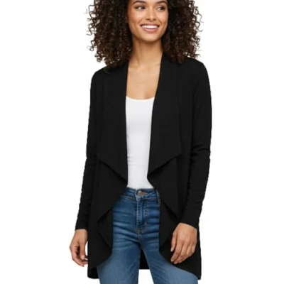 Women's Waterfall Cardigan Elegant Open Front Draped Blazer designed for effortless layering and all-day comfort. Whether dressing up for work or creating a relaxed casual look, this long-sleeve, open-front cardigan is a must-have for every season. Draped Waterfall Draped Waterfall Design Featuring a flowy, cascading front, this cardigan creates a flattering silhouette that enhances any outfit. The hanky hem cut adds a touch of graceful movement to your look. Approximate Length: 35 Inches With its flowy and flattering cut, this cardigan falls beautifully, offering comfortable coverage and an effortlessly chic appearance. Made from a luxurious blend of 95% Viscose & 5% Elastane, the material is super soft, breathable, and stretchable, ensuring a comfortable and lightweight feel throughout the day. Designed for plus-size and regular wearers, this relaxed-fit cardigan drapes beautifully over any body type, creating a streamlined and elegant look. Perfect for All Seasons: This longline waterfall blazer is ideal for year-round wear, providing a light extra layer in spring and summer, while being great for layering in autumn and winter. Pair with jeans and a basic tee for a relaxed yet stylish outfit. Layer over a blouse and trousers for a professional, polished look
