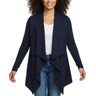 Women's Waterfall Cardigan Elegant Open Front Draped Blazer designed for effortless layering and all-day comfort. Whether dressing up for work or creating a relaxed casual look, this long-sleeve, open-front cardigan is a must-have for every season. Draped Waterfall Draped Waterfall Design Featuring a flowy, cascading front, this cardigan creates a flattering silhouette that enhances any outfit. The hanky hem cut adds a touch of graceful movement to your look. Approximate Length: 35 Inches With its flowy and flattering cut, this cardigan falls beautifully, offering comfortable coverage and an effortlessly chic appearance. Made from a luxurious blend of 95% Viscose & 5% Elastane, the material is super soft, breathable, and stretchable, ensuring a comfortable and lightweight feel throughout the day. Designed for plus-size and regular wearers, this relaxed-fit cardigan drapes beautifully over any body type, creating a streamlined and elegant look. Perfect for All Seasons: This longline waterfall blazer is ideal for year-round wear, providing a light extra layer in spring and summer, while being great for layering in autumn and winter. Pair with jeans and a basic tee for a relaxed yet stylish outfit. Layer over a blouse and trousers for a professional, polished look