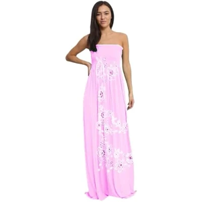 STAR FASHION Women's Elasticated Sheering Maxi Dress Chunky Flower Print Strapless Bandeau Boobtube Sleeveless Gather UK Size 8 22 Baby Pink
