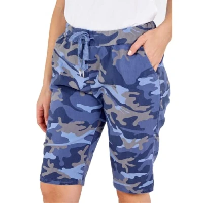 STAR FASHION Women’s Italian Camouflage Print Elastic Waist Magic Shorts Ladies Knee Length 3/4 Cropped Trousers Turn Up Side Pockets Drawstring Belt Summer Beach Pants Short Pajamas Blue