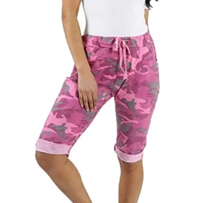 STAR FASHION Women’s Italian Camouflage Print Elastic Waist Magic Shorts Ladies Knee Length 3/4 Cropped Trousers Turn Up Side Pockets Drawstring Belt Summer Beach Pants Short Pajamas Hot Pink