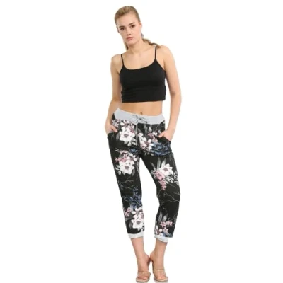 STAR FASHION Women's Italian Elastic Waist Active Yoga Floral Printed Jogging Pants Turn Up Ladies Casual Jogger Hoop Trouser Big Flower Black 12 14