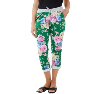 STAR FASHION Women's Italian Elastic Waist Active Yoga Floral Printed Jogging Pants Turn Up Ladies Casual Jogger Hoop Trouser Green 8 10