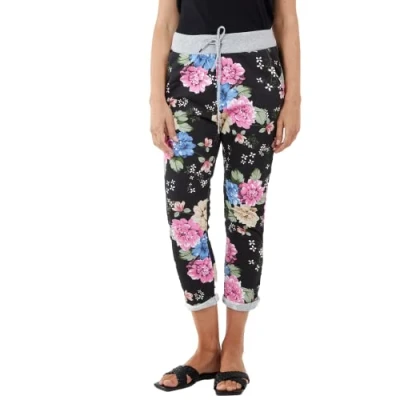 STAR FASHION Women's Italian Elastic Waist Active Yoga Floral Printed Jogging Pants Turn Up Ladies Casual Jogger Hoop Trouser Multi Black 8 10