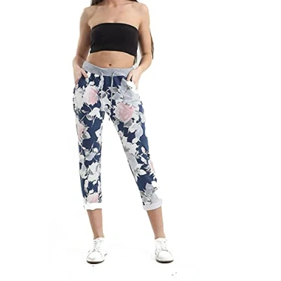 STAR FASHION Women's Italian Elastic Waist Active Yoga Floral Printed Plain Jogging Pants Turn Up Ladies Casual Jogger Hoop Trouser Blue Flower 16 18