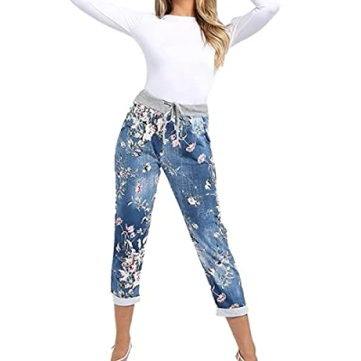 STAR FASHION Women's Italian Elastic Waist Active Yoga Floral Printed Plain Jogging Pants Turn Up Ladies Casual Jogger Hoop Trouser Dark Denim 12 14
