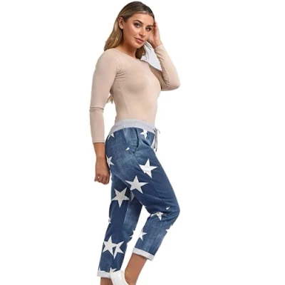 Star FASHION Women's Italian Elastic Waist Active Yoga Floral Printed Plain Jogging Pants Turn Up Ladies Casual Jogger Hoop Trouser Deim Blue 16 18