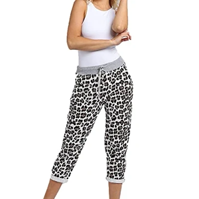 STAR FASHION Women's Italian Elastic Waist Active Yoga Floral Printed Plain Jogging Pants Turn Up Ladies Casual Jogger Hoop Trouser Leopard Print 16 18