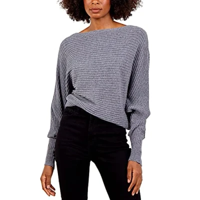 STAR FASHION Women’s Ladies Ribbed Batwing Jumper/Sweater Boat Neck Loose Knitted Baggy Pullover Blouses Sweatshirts Tops Soft Knitwear One Size (UK_ 10 18) Dark Grey