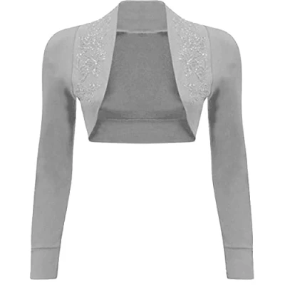 STAR FASHION Women’s Long Sleeve Beaded Shrug Ladies Collared Short Bolero Crop Cardigan Top Open Front Shrugs UK Size 8 14 Light Grey