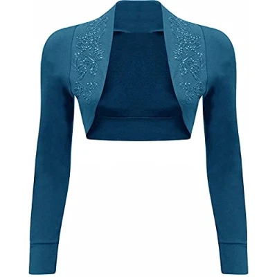 STAR FASHION Women’s Long Sleeve Beaded Shrug Ladies Collared Short Bolero Crop Cardigan Top Open Front Shrugs UK Size 8 14 Teal
