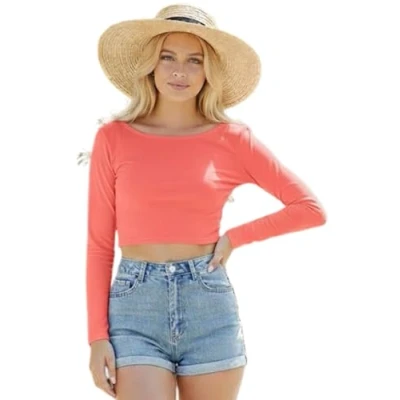 STAR FASHION Women’s Long Sleeve Crop Top Ladies Round Neck Cropped T Shirt Short Mini Plain Printed Tops Coral 12 14