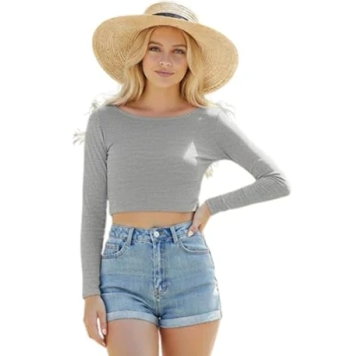 STAR FASHION Women’s Long Sleeve Crop Top Ladies Round Neck Cropped T Shirt Short Mini Plain Printed Tops Grey 12 14