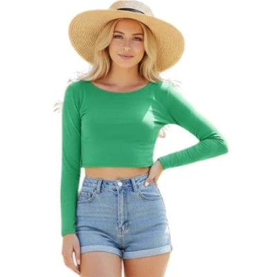 STAR FASHION Women’s Long Sleeve Crop Top Ladies Round Neck Cropped T Shirt Short Mini Plain Printed Tops Jade Green 8 10