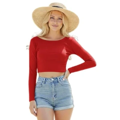 STAR FASHION Women’s Long Sleeve Crop Top Ladies Round Neck Cropped T Shirt Short Mini Plain Printed Tops Red 12 14