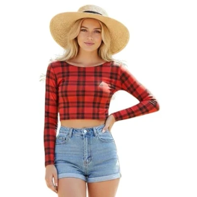 STAR FASHION Women’s Long Sleeve Crop Top Ladies Round Neck Cropped T Shirt Short Mini Plain Printed Tops Red Tartan 12 14