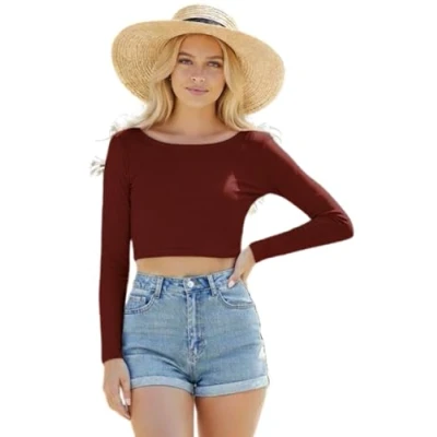 STAR FASHION Women’s Long Sleeve Crop Top Ladies Round Neck Cropped T Shirt Short Mini Plain Printed Tops Wine 8 10