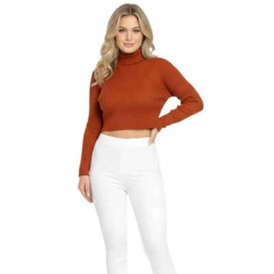 STAR FASHION Women's Long Sleeve Knitted Polo Neck Crop Top Ladies High Roll Jumpers Sweatshirts Size UK 8 14 Rust