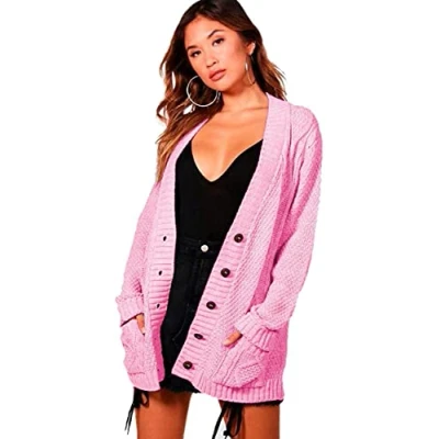STAR FASHION Women's Open Front Five Button Grandad Cardigans Chunky Cable Knitted Long Sleeve Winter Tops Sweaters Jumpers Size UK 8 26 Baby Pink