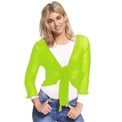 STAR FASHION Women's Plain Fish Net Knotted Tie Up Bolero Shrug Crop Top Ladies Knitted Three Quarter Sleeve Cardigan Blouse Stretchy Lightweight One Size Fits All 8 14 Lime Green