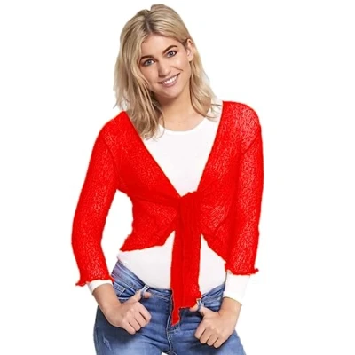 STAR FASHION Women's Plain Fish Net Knotted Tie Up Bolero Shrug Crop Top Ladies Knitted Three Quarter Sleeve Cardigan Blouse Stretchy Lightweight One Size Fits All 8 14 Red