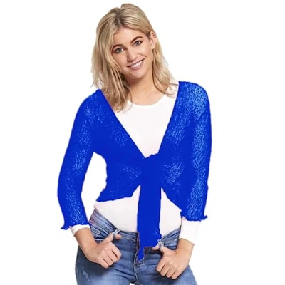 STAR FASHION Women's Plain Fish Net Knotted Tie Up Bolero Shrug Crop Top Ladies Knitted Three Quarter Sleeve Cardigan Blouse Stretchy Lightweight One Size Fits All 8 14 Royal Blue