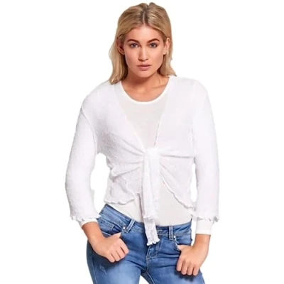 STAR FASHION Women's Plain Fish Net Knotted Tie Up Bolero Shrug Crop Top Ladies Knitted Three Quarter Sleeve Cardigan Blouse Stretchy Lightweight One Size Fits All 8 14 White
