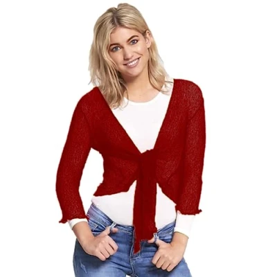 STAR FASHION Women's Plain Fish Net Knotted Tie Up Bolero Shrug Crop Top Ladies Knitted Three Quarter Sleeve Cardigan Blouse Stretchy Lightweight One Size Fits All 8 14 Wine