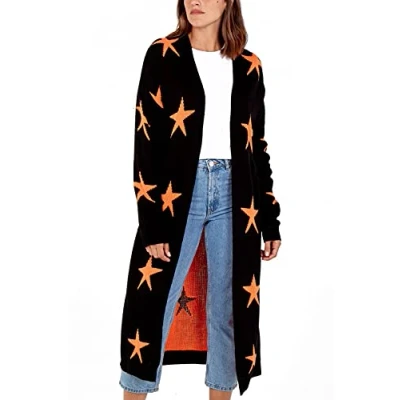 Star FASHION Women's Print Open Front Edge to Knitted Long Cardigans Coat Ladies Warm Sweaters Casual Pockets UK Size 10 16 Black/Orange