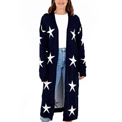 Star FASHION Women's Print Open Front Edge to Knitted Long Cardigans Coat Ladies Warm Sweaters Casual Pockets UK Size 10 16 Navy/White