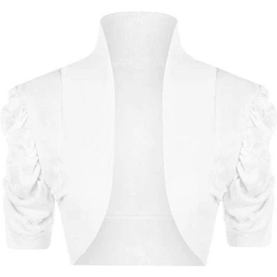 STAR FASHION Women’s Puff Sleeve Stretchy Ribbed Bolero Shrug Ladies Collared Plain Style Crop Cardigan Top Open Front Shrugs UK Size 8 14 White