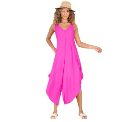 Lightweight and comfortable: This jumpsuit is made from 100% viscose, which is a lightweight and breathable fabric that is perfect for summer. Unique look: The v-neck and long length give this jumpsuit a unique and stylish look that is perfect for any occasion. Flowy and comfortable: The flowy fabric of this jumpsuit allows you to move freely and feel comfortable all day long. Perfect for summer: This jumpsuit is ideal for a day at the beach, a casual outing, or a summer party. Available in sizes 8-10, 12-14, and 16-18: This jumpsuit is available in a variety of sizes to fit all body types.