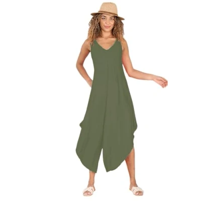 Lightweight and comfortable: This jumpsuit is made from 100% viscose, which is a lightweight and breathable fabric that is perfect for summer. Unique look: The v-neck and long length give this jumpsuit a unique and stylish look that is perfect for any occasion. Flowy and comfortable: The flowy fabric of this jumpsuit allows you to move freely and feel comfortable all day long. Perfect for summer: This jumpsuit is ideal for a day at the beach, a casual outing, or a summer party. Available in sizes 8-10, 12-14, and 16-18: This jumpsuit is available in a variety of sizes to fit all body types.