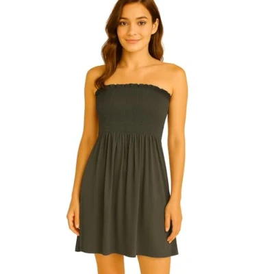 STAR FASHION Women Strapless Sheering Top Plain Bandeau Boob Tube Sleeveless Sharing Shorts Midi Dress Charcoal UK 20 22