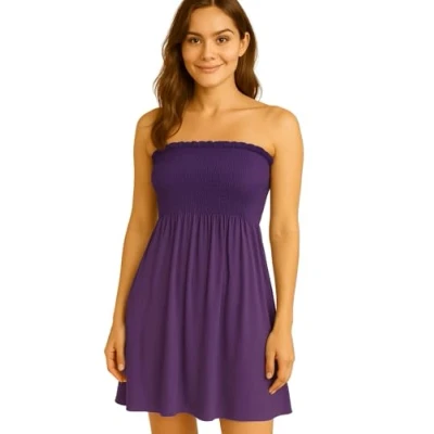 STAR FASHION Women Strapless Sheering Top Plain Bandeau Boob Tube Sleeveless Sharing Shorts Midi Dress Purple UK 12 14