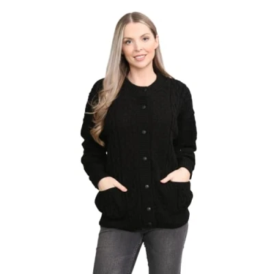 STAR FASHION Womens Aran Cable Knitted 7 Button Cardigan Ladies Loose and Stretchy Long Sleeve 2 Pocket Round Neck Sweater Cadigan Black 16 18