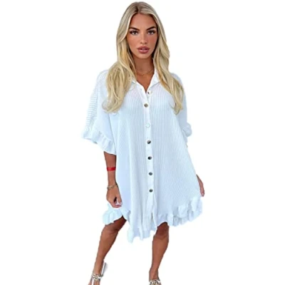 The Women's Button Pleated Short Sleeve Plain Mini Collared Dress is a stylish and versatile option for summer wear. The dress features a flattering v-neckline and a frill hem design that adds a playful touch to the outfit. Made with 100% cotton material, the dress is breathable and comfortable to wear, perfect for warmer weather. The dress comes in a crinkle pattern and features a button-down fastening that adds a unique texture to the overall look. Available in UK sizes 12-14, 16-18, and 20-22, the dress can fit a range of body types and sizes, with a loose fit and oversized baggy style that provides ease of movement and a comfortable, casual look.