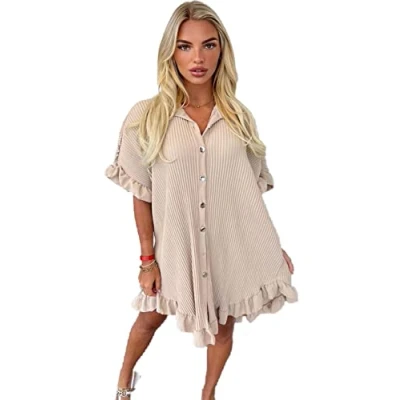 STAR FASHION Womens Button Pleated Short Sleeve Mini Collared Dress with Frill Hem Open Stretchy Beach Outwear for Casual Walks Loose Fit Oversized Baggy Swing Smock Summer Dresses Sone 16 18