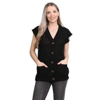 STAR FASHION Womens Cable Knitted 5 Button Cardigan Ladies Loose and Stretchy Sleeveless 2 Pocket V Neck Sweater Cadigan UK Size 8 to 22 Black