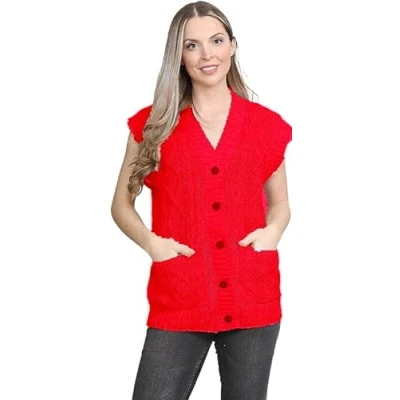 STAR FASHION Womens Cable Knitted 5 Button Cardigan Ladies Loose and Stretchy Sleeveless 2 Pocket V Neck Sweater Cadigan UK Size 8 to 22 Red
