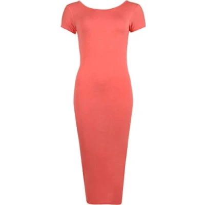 STAR FASHION Womens Cap Sleeve Bodycon Midi Dress Ladies Wiggle Pencil Round Neck Long Stretch Maxi Plus Size Casual Party Wear Coral