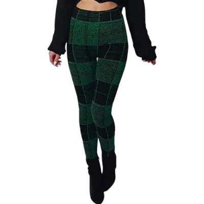 STAR FASHION Womens Full Length Knitted Leggings Ladies Thick Warm Printed Knitwear Legging Winter Wear Bottoms Green Tartan