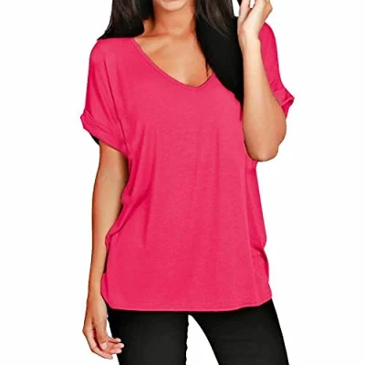 Oversized Fit: Relaxed, loose fit with stylish batwing sleeves. V Neck: Flattering V-neckline for a feminine, versatile touch. Turn-Up Sleeves: Fashionable roll-over short sleeves for a summer vibe. Soft & Light: Breathable, stretchy fabric; machine washable. Versatile: Easy to pair with jeans, shorts, or skirts for any occasion.