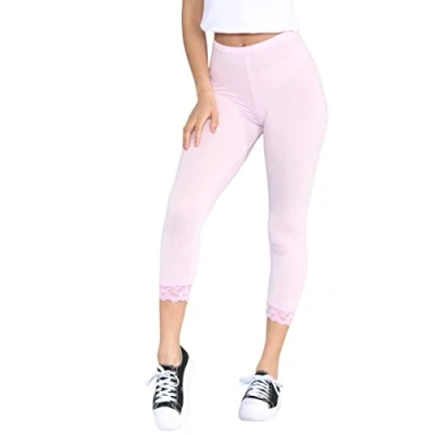 STAR FASHION Womens Ladies ¾ Cropped Capri Lace Trim Leggings Stretchy Soft Tights Yoga Pants Elasticated Waist Shorts for Jogging UK Baby Pink 16 18
